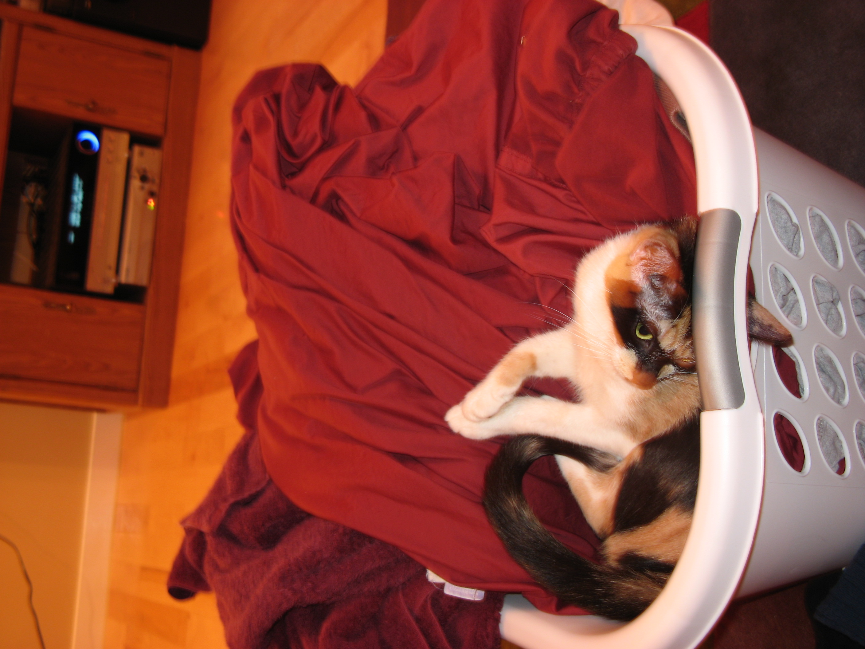 Sadie, our new kitty, plays around in our fresh laundry.